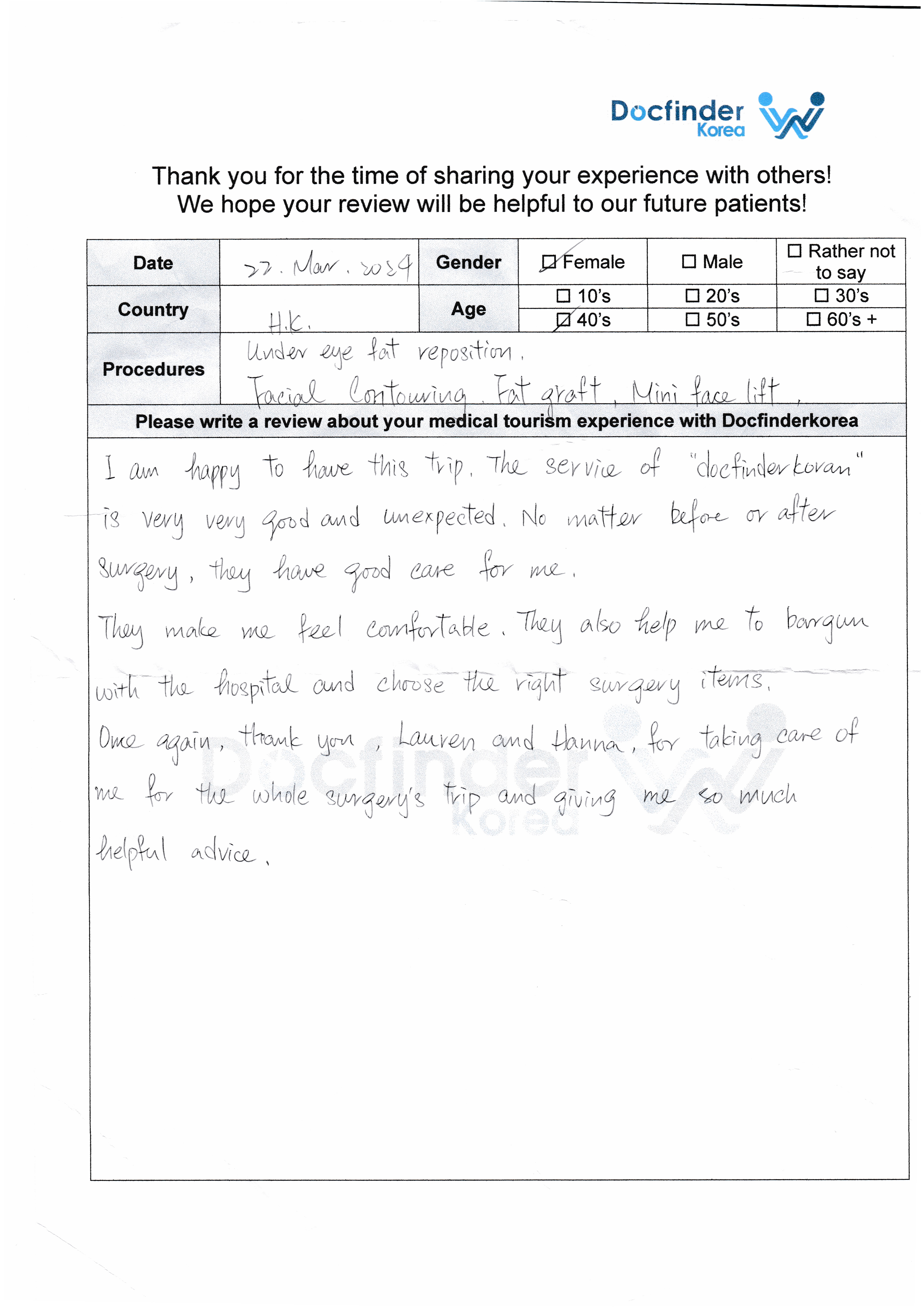 我很高興有這次旅行。 「docfinderkorea」的服務非常非常好,出乎意料。 無論手術前或手術後,他們都對我照顧得很好。