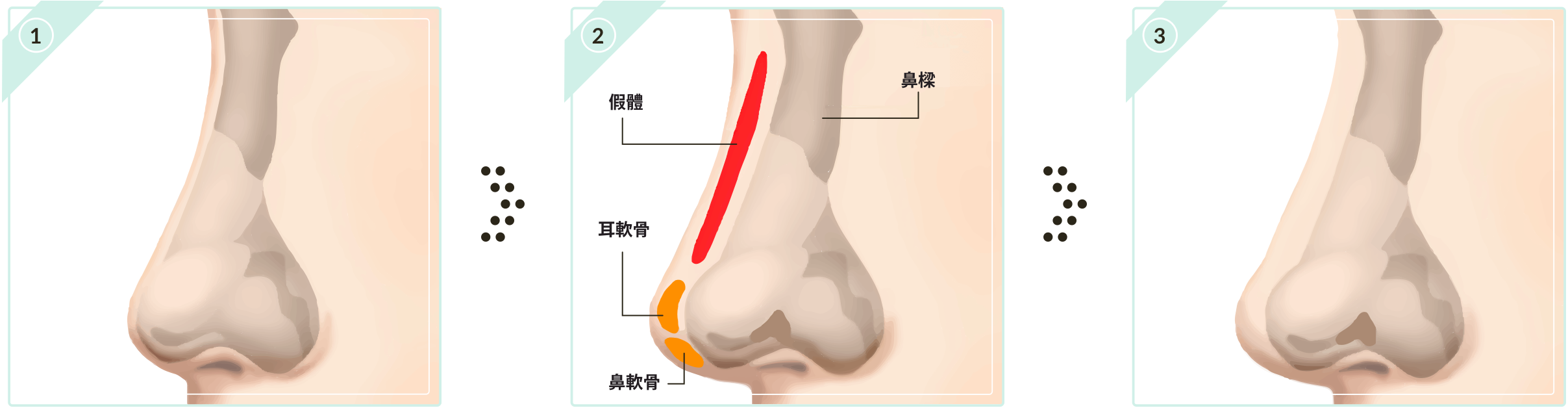 - 置入客製的鼻樑假體以墊高鼻樑。如有需要,自體鼻尖軟骨或耳軟骨也會被使用於鼻尖塑型