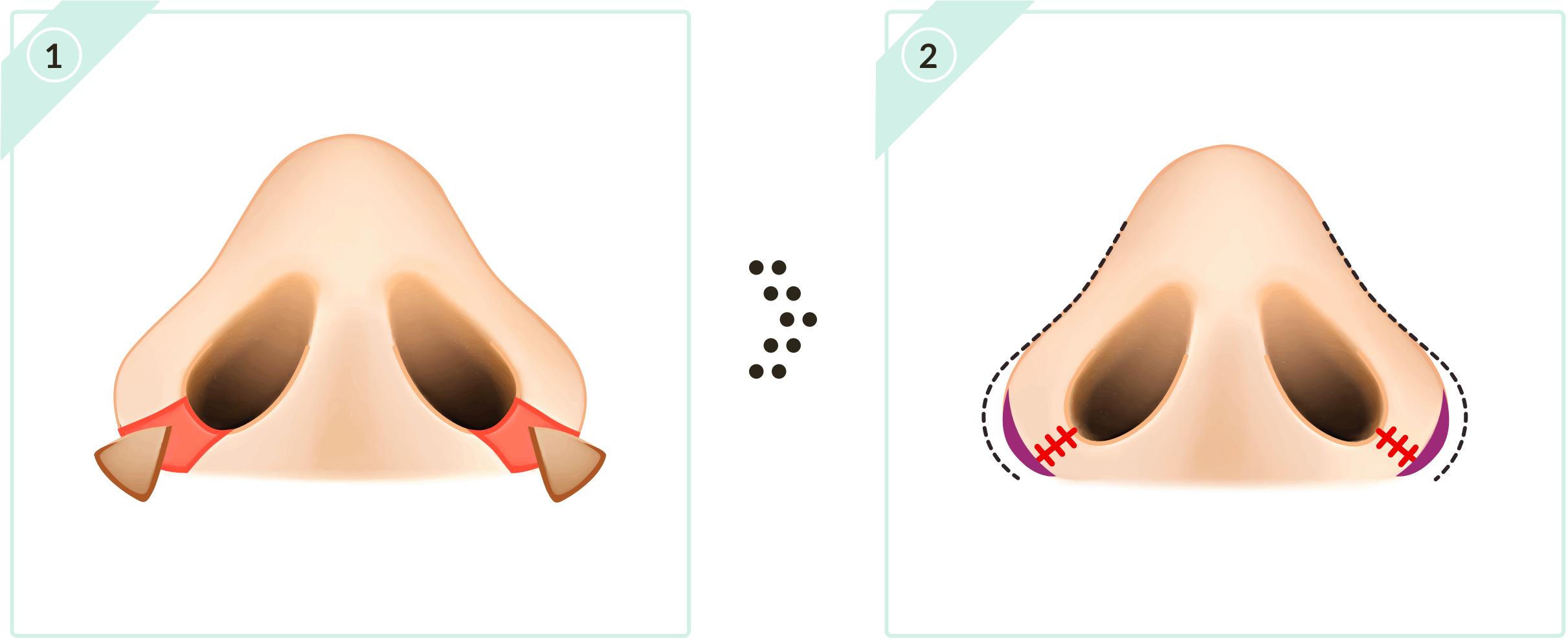 - 将宽大的鼻翼向内侧拉拢后进行缝合来达到鼻翼缩小的效果