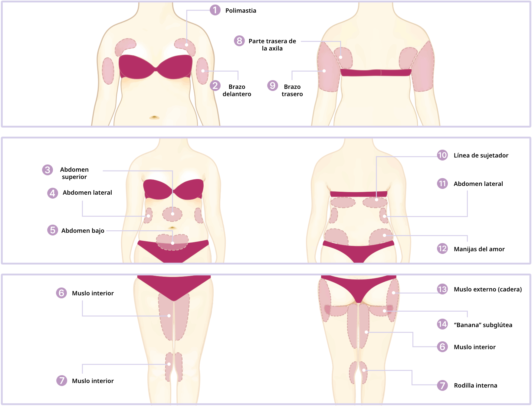 Las áreas más comunes en las que se realiza la liposucción en Corea suelen ser el abdomen, la espalda, las cartucheras, y los muslos. Aún así, hay muchas otras zonas del cuerpo en las que, según la condición del paciente y la cantidad de grasa, también pueden ser intervenidas durante la liposucción. En la siguiente imagen puedes chequear todas las zonas: