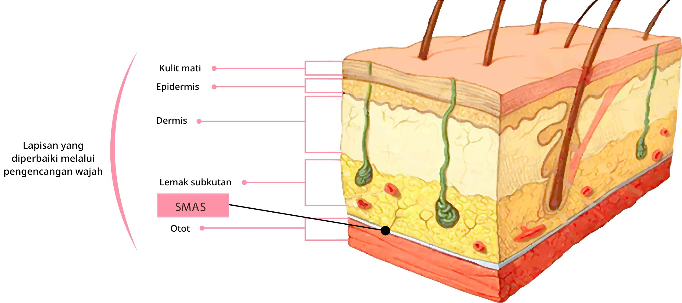 Lapisan SMAS adalah lapisan otot sangat tipis yang menutupi seluruh permukaan wajah dan menyalurkan pergerakan otot wajah ke kulit. Lapisan SMAS sensitif terhadap gravitasi, hal ini jadi menyebabkan kerutan dan menyebabkan kulit menjadi kendur seiring berjalannya waktu. Jika hanya lapisan kulit yang dikencangkan, maka tanda-tanda penuaan akan segera terlihat Kembali jika lapisan SMAS tidak diseimbangkan dengan kulit. Untuk mendapatkan efek pengencangan yang lebih kuat, penting untuk memperbaiki lapisan SMAS sekaligus.