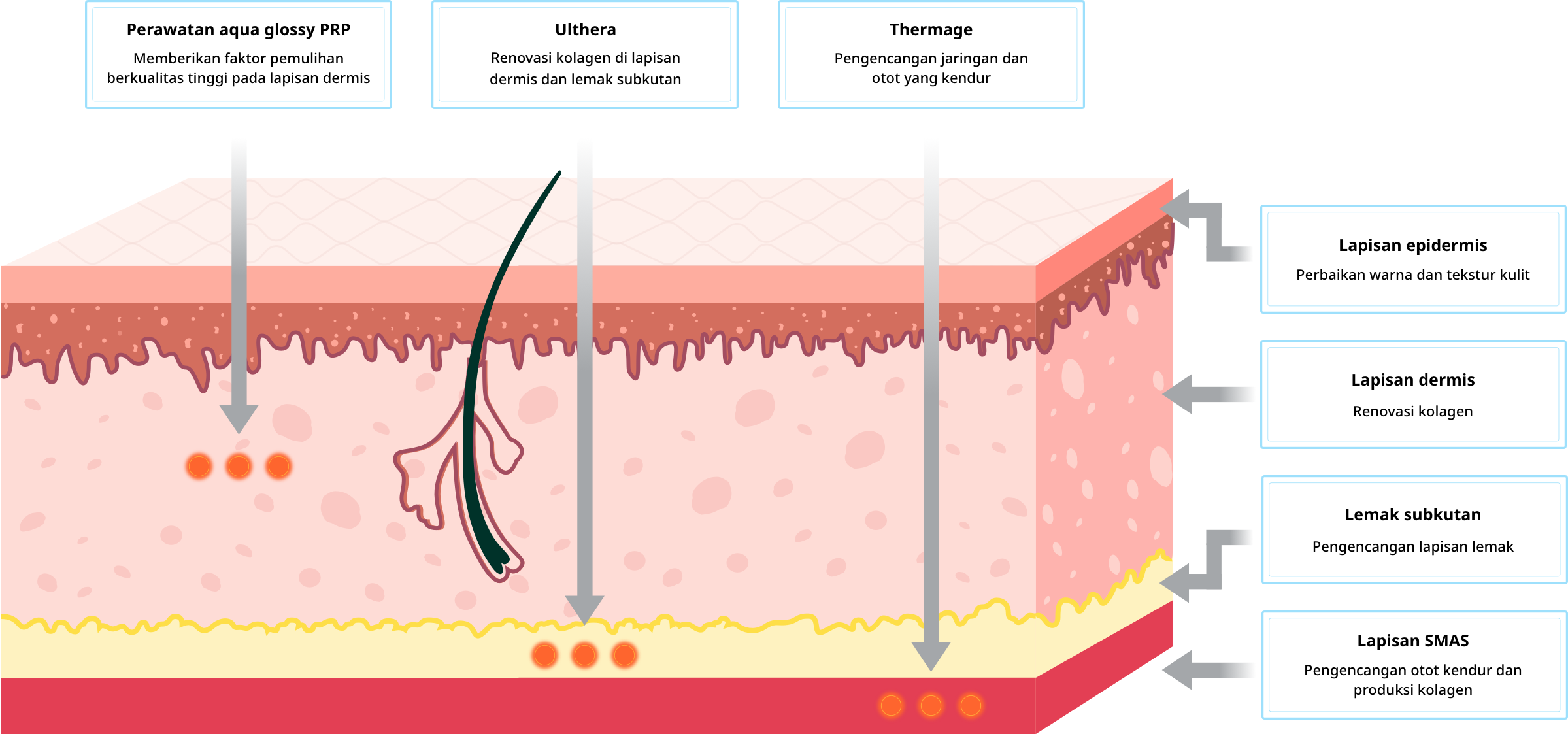 Kombinasi pengangkatan yang cepat dan kuat dengan pengencangan yang mantap. Menembus dengan cepat dan jauh ke dalam kulit untuk mengangkat dan mengencangkan dengan erat. Sekali mendayung dua tiga pulai terlampaui! Ulthera memberikan pengangkatan yang kuat dan thermage memberikan pengencangan. Memperbaiki epidermis, dermis, dan hingga lapisan SMAS sekaligus.