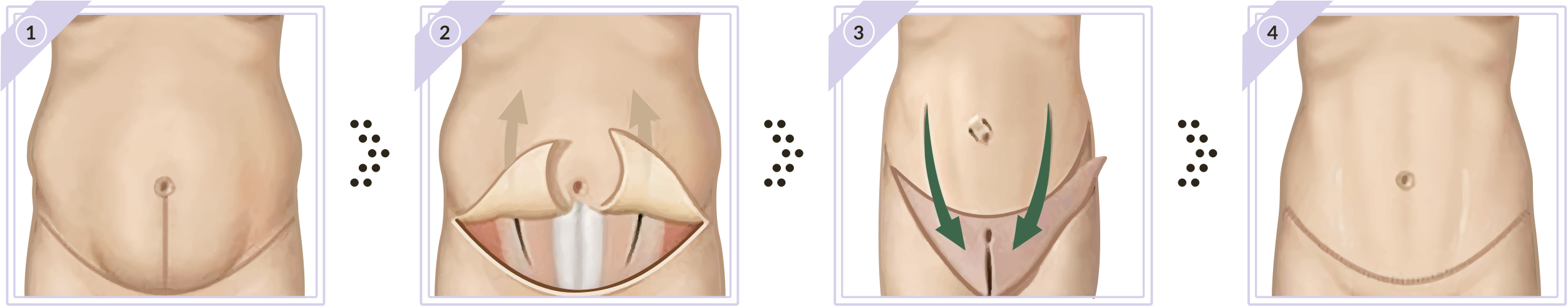 上腹部と下腹部の脂肪、たるんだ皮膚、緩んだ筋肉を除去する最も一般的に行われる手術です。必要に応じて、おへその位置や形も改善することができます。切開は帝王切開より少し長くなりますが、その場所は下着や水着で簡単に隠せます。