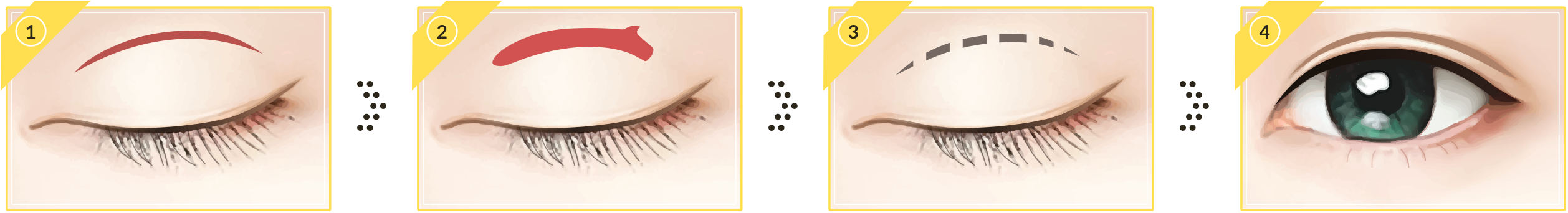 Разрезы выполняются вдоль новой складки века, которую хирург планирует заранее. С помощью этих разрезов хирург избавляется от излишней кожи, жира и мышц. Разрезы делаются таким образом, чтобы шрам был менее заметен и скрыт за новой складкой.
